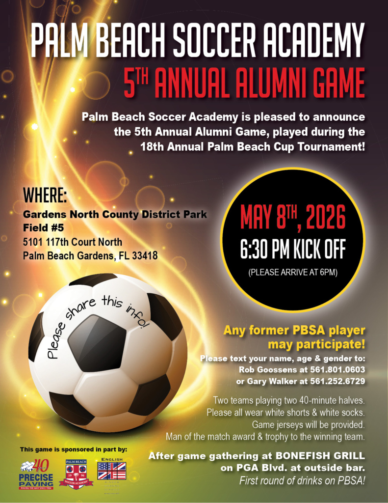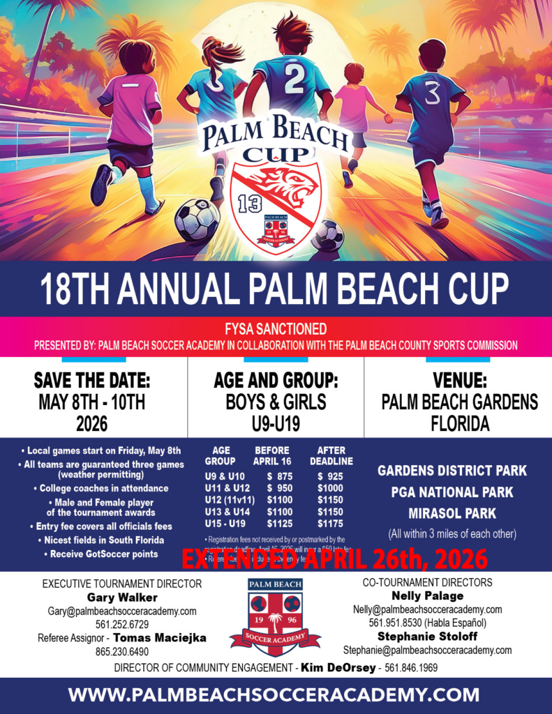 Palm Beach Soccer Academy Fan Wear The 15th AnnualPBSA Summer Futsal CupPalm Beach Soccer Academy and City of Palm Beach Gardens are pleased to announce another successful summer indoor program. Congratulations to the all girls team who won the 2025 Futsal Cup. As we end our 15th season anniversary in this great new indoor facility, we look forward to next summer continuing partnership. Thanks to everyone who attended and help make this amazing event successful. Gary WalkerFounder and CEO Palm Beach Soccer Academy & Palm Beach Cup